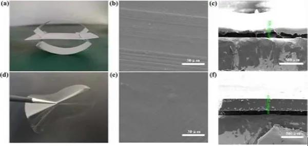 (e,f)PDMS薄膜表面和橫截面的SEM圖像。