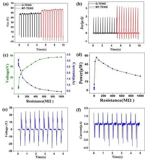(e,f)50MΩ MT-TENG的輸出電壓和電流。