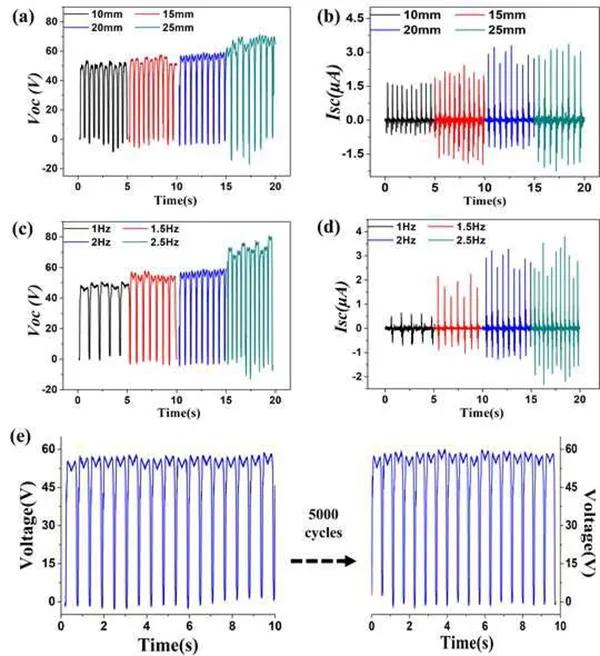 (c,d)MT-TENG的開路電壓和短路電流隨頻率的變化而變化;