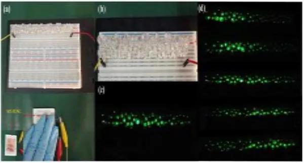 (b)手指按壓時,53個綠色LEDs由MT-TENG供電;
