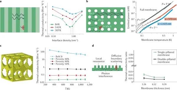 (d)柱狀結(jié)構(gòu)導(dǎo)熱系數(shù)降低的三種機(jī)制示意圖,雙柱撐膜(兩側(cè)有柱)和單柱撐膜(僅一側(cè)有柱)的導(dǎo)熱系數(shù)比相同厚度的均勻膜低兩個(gè)數(shù)量級(jí)。