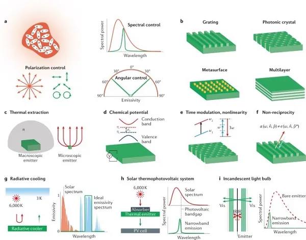 (a)傳統(tǒng)的黑體熱輻射(橙色)和納米結(jié)構(gòu)控制的熱輻射(綠色)。