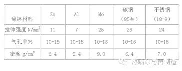 (1)涂層結(jié)構(gòu)和特性。線材火焰噴涂的涂層結(jié)構(gòu)為明顯的層狀結(jié)構(gòu),涂層中有較多的孔隙和氧化物夾渣。涂層性能依據(jù)噴涂工藝和噴涂材料的不同而各異,一般數(shù)據(jù)下表。