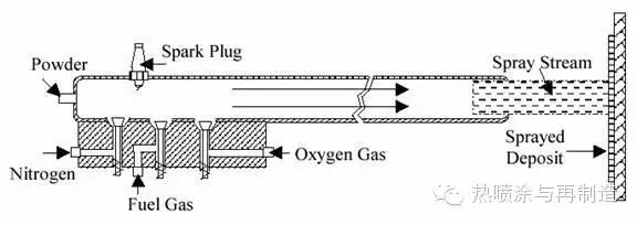 3)點(diǎn)火。向槍膛中的爆炸室發(fā)出給定頻率的點(diǎn)火信號(hào),使可燃?xì)怏w爆炸爆炸持續(xù)時(shí)間約幾毫秒,產(chǎn)生3300℃左右的高溫和大約1500m/s的氣流,高熱高速氣流使待涂覆的粉末顆粒受熱軟化,并以600m/s-700m/s的初速離開槍口射向基體表面。當(dāng)粉末顆粒撞擊基體表面時(shí),動(dòng)能轉(zhuǎn)化為熱能,撞擊瞬間可使粉末顆粒溫度升高,甚至可以達(dá)到其熔點(diǎn)。于是就形成孔隙率極低,結(jié)合強(qiáng)度很高的表面涂層。爆炸中心溫度、氣流速度和粉末顆粒射出槍口初速與燃爆氣體種類和噴槍結(jié)構(gòu)有關(guān)。
