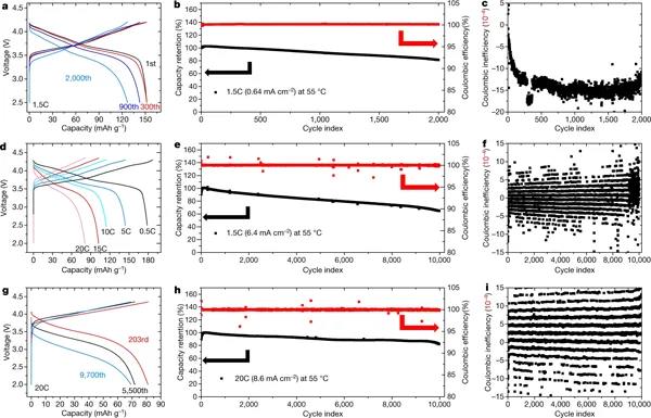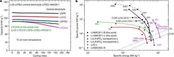 鋰金屬因其高容量和能量密度而被認(rèn)為是鋰離子電池負(fù)極的最佳候選材料,而單晶LiNi0.8Mn0.1Co0.1O2(NMC811)被認(rèn)為是下一代正極材料。采用NMC81正極與鋰金屬負(fù)極配對的電池的穩(wěn)定循環(huán)非常重要。然而,這種電池與大多數(shù)電解質(zhì),無論是液體還是固體,其穩(wěn)定性都很差。眾所周知,Li10±xM1±yP2±pS12±q(M=Ge,Si)與金屬鋰不穩(wěn)定。通常應(yīng)用石墨或金屬銦等保護(hù)層來絕緣固體電解質(zhì)和金屬鋰之間的接觸。如果沒有這種保護(hù),使用純金屬鋰作為電極和Li10Ge1P2S12(LGPS)作為電解質(zhì)的對稱電池會(huì)在有電壓火花的情況下迅速失效。盡管大多數(shù)硫化物固體電解質(zhì)在與金屬鋰接觸時(shí)會(huì)發(fā)生一定程度的分解,但硫銀鍺礦型Li6-yPS5-yCl1+y與金屬鋰比LGPS更穩(wěn)定。Li5.5PS4.5Cl1.5(LPSCl)可以運(yùn)行150小時(shí)以上。然而,之后仍然會(huì)出現(xiàn)短路。今日,在哈佛大學(xué)李鑫教授(通訊作者)團(tuán)隊(duì)帶領(lǐng)下,報(bào)告了一種界面穩(wěn)定性(對鋰金屬響應(yīng))分層結(jié)構(gòu)的固態(tài)電池設(shè)計(jì),實(shí)現(xiàn)無鋰枝晶穿透的超高電流密度。多層設(shè)計(jì)將較不穩(wěn)定的電解質(zhì)夾在較穩(wěn)定的固體電解質(zhì)之間,通過在較不穩(wěn)定的電解質(zhì)層中局部分解,阻止了任何鋰枝晶的生長。團(tuán)隊(duì)提出了一種類似于膨脹螺絲效應(yīng)的機(jī)制,即任何裂縫都被動(dòng)態(tài)生成的分解物所填充,而這些分解也受到很好的約束,可能是由分解引起的“錨定”效應(yīng)。鋰金屬負(fù)極與LiNi0.8Mn0.1Co0.1O2正極配對的循環(huán)性能非常穩(wěn)定,在20 C倍率下進(jìn)行10000次循環(huán)后,容量保持率為82%(8.6 mA/cm2),在1.5C倍率下進(jìn)行2000次循環(huán)后容量保持率為81.3%(0.64 mA/cm2)。同時(shí),在微米級正極材料水平還能實(shí)現(xiàn)110.6 kW/kg的比功率和631.1 Wh/kg的比能量。相關(guān)成果以題為“A dynamic stability design strategy for lithium metal solid state batteries”發(fā)表在了Nature。