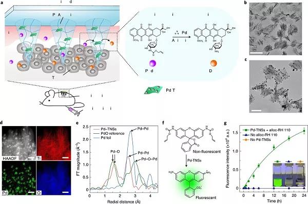 過渡金屬介導(dǎo)的生物正交催化激發(fā)了人工化學(xué)的一個(gè)新分支,與酶促反應(yīng)互補(bǔ),使生物分子的選擇性標(biāo)記或通過非自然過程原位合成生物活性劑成為可能。然而,由于金屬毒性的安全問題和催化劑的應(yīng)用過程復(fù)雜等原因,生物正交催化在體內(nèi)的有效應(yīng)用仍然具有挑戰(zhàn)性。基于此,浙江大學(xué)顧臻教授(通訊作者)等人報(bào)道了一種具有生物正交催化活性的微針陣列貼片裝置。作者以聚乙烯醇(PVA)為基體,沉積有鈀納米粒子(Pd NPs)的TiO2納米片(Pd-TNSs)為納米填料,制備了該微針陣列貼片裝置。其中,摻入Pd-TNSs可以增強(qiáng)微針在干玻璃狀態(tài)下的力學(xué)性能,賦予它們足夠的強(qiáng)度,以微創(chuàng)的方式穿透皮膚。當(dāng)置于水環(huán)境中時(shí),微針就會(huì)變成膨脹的水凝膠狀態(tài),形成多孔結(jié)構(gòu)。因此,三個(gè)層次的結(jié)構(gòu)層次,即三維(3D)針陣列、每個(gè)針基質(zhì)中的微孔和網(wǎng)絡(luò)中高度暴露的Pd-TNSs表面,促進(jìn)了籠狀分子的擴(kuò)散以與Pd納米粒子接觸,從而促進(jìn)了它們的活化。需注意,通過使用小鼠黑色素瘤模型,證明了系統(tǒng)給藥的前藥N-烯丙基氧羰基籠狀阿霉素(alloc-DOX)的局部腫瘤內(nèi)活化,不僅能夠增加劑量,而且限制了對(duì)健康器官和組織的副作用。此外,Pd-TNSs與PVA之間的界面相互作用以及PVA鏈形成的氫鍵使得微針針尖在水合物狀態(tài)下具有足夠的力學(xué)韌性,從而易于去除整個(gè)貼片,而不會(huì)留下有害的過渡金屬(TMs)或引起炎癥。