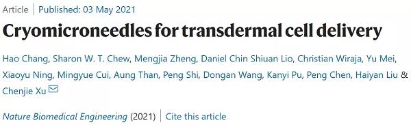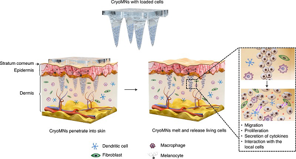 研究發(fā)現(xiàn),簡(jiǎn)單、安全和有效的治療細(xì)胞的透皮遞送技術(shù)有助于治療皮膚疾病的細(xì)胞療法。通過皮下注射針頭的常規(guī)細(xì)胞遞送與患者依從性差有關(guān),存在需要經(jīng)過培訓(xùn)的人員、產(chǎn)生廢物且具有不可忽視的傷害和感染風(fēng)險(xiǎn)的問題?;诖?,香港城市大學(xué)Chenjie Xu(通訊作者)等人報(bào)道了一種冷凍微針貼片的設(shè)計(jì)和概念應(yīng)用,并且該冷凍微針貼片可用于活細(xì)胞的透皮傳遞。這種微針是用預(yù)先懸浮的細(xì)胞在低溫培養(yǎng)基中進(jìn)行分步低溫微模塑法制備而成,在細(xì)胞復(fù)蘇后可以很容易插入豬皮中溶解。在小鼠體內(nèi),冷凍微針遞送的細(xì)胞保留了它們的生存能力和增殖能力。在患有皮下黑色素瘤的小鼠中,通過冷凍微針遞送的卵清蛋白脈沖的樹突狀細(xì)胞引起了更高的抗原特異性免疫反應(yīng),并且導(dǎo)致腫瘤生長(zhǎng)比靜脈和皮下注射的細(xì)胞更慢。具有生物相容性的冷凍微針可促進(jìn)微創(chuàng)細(xì)胞遞送,用于一系列的細(xì)胞治療。