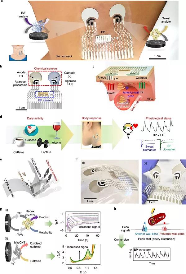 為了監(jiān)測(cè)日?;顒?dòng)對(duì)人體生理反應(yīng)的影響,需要一種能夠同時(shí)跟蹤代謝和血流動(dòng)力學(xué)參數(shù)的可穿戴器件?;诖?,美國(guó)加州大學(xué)圣地亞哥分校Joseph Wang和Sheng Xu(共同通訊作者)等人報(bào)道了一種非侵入性皮膚穿戴器件,通過超聲波傳感器同時(shí)監(jiān)測(cè)血壓和心率,并通過電化學(xué)傳感器同時(shí)監(jiān)測(cè)多種生物標(biāo)志物。作者優(yōu)化了集成器件,使其在符合彎曲皮膚表面的同時(shí)提供力學(xué)彈性和靈活性,并且確??煽康馗兄M織間液中的葡萄糖和汗液中的乳酸、咖啡因和酒精,而各個(gè)傳感器之間沒有串?dāng)_。在人類志愿者身上,該器件捕捉到了食物攝入和運(yùn)動(dòng)的生理效應(yīng),特別是在食物消化后葡萄糖的產(chǎn)生,通過糖酵解消耗葡萄糖,以及血壓和心率的增加,以補(bǔ)償氧氣的消耗和乳酸的產(chǎn)生。通過集成的可穿戴器件進(jìn)行連續(xù)、同步的聲學(xué)和電化學(xué)傳感,可以豐富對(duì)人體日?;顒?dòng)響應(yīng)的理解,并且有助于對(duì)異常生理變化的早期預(yù)測(cè)。