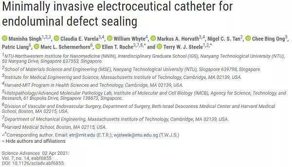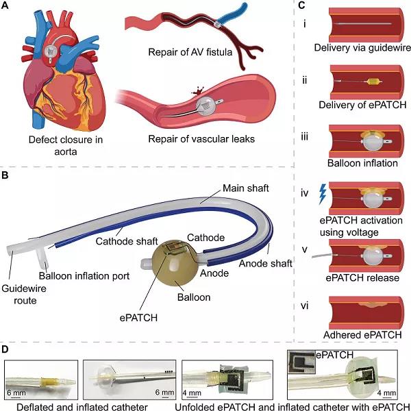 腔內(nèi)缺損的外科手術(shù)修復(fù)與圍手術(shù)期發(fā)病率和死亡率有關(guān)。利用組織粘合劑進(jìn)行血管內(nèi)修復(fù)可以減少宿主組織損傷,但是目前的生物粘合劑設(shè)計(jì)不支持微創(chuàng)部署。其中,電壓激活的組織粘合劑為腔內(nèi)修復(fù)提供了一種新的策略。為了促進(jìn)電壓激活粘合劑的臨床轉(zhuǎn)化,新加坡南洋理工大學(xué)Terry W. J. Steele和麻省理工學(xué)院Ellen T. Roche(共同通訊作者)等人報(bào)道了將一種電壓激活貼片(ePATCH)與一種帶有可拉伸電極的微創(chuàng)導(dǎo)管(CATRE)配對(duì),以對(duì)抗體內(nèi)和體外管腔缺陷的修復(fù)。ePATCH/CATRE平臺(tái)展示了在濕組織基底上密封直徑高達(dá)2 mm的管腔缺損。防水密封件具有柔韌性和回彈力,可承受20000多次生理相關(guān)的應(yīng)力/應(yīng)變循環(huán)。當(dāng)心臟跳動(dòng)時(shí),ePATCH被電激活,沒有觀察到電信號(hào)中斷。ePATCH/CATRE平臺(tái)具有廣泛的潛在應(yīng)用,從假性動(dòng)脈瘤/瘺的血管內(nèi)治療到生物電極,再到電生理標(biāo)測(cè)。