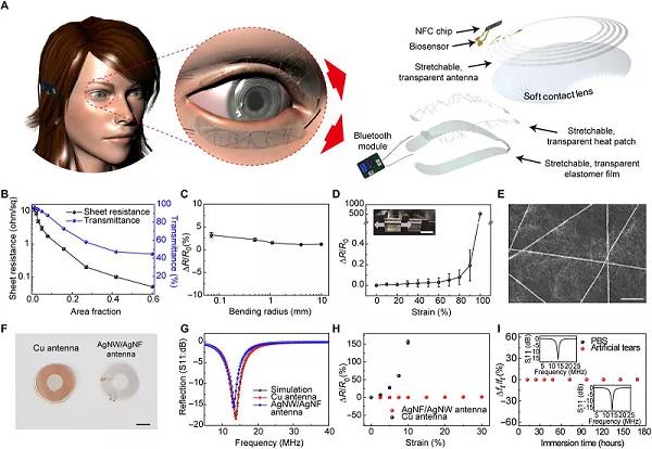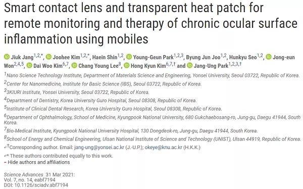可穿戴電子器件能夠監(jiān)測(cè)人體的生理信號(hào),提供生物醫(yī)學(xué)信息,已成為可持續(xù)的個(gè)人健康管理領(lǐng)域的熱點(diǎn)?;诖?,韓國(guó)延世大學(xué)Jang-Ung Park和韓國(guó)慶北大學(xué)Hong Kyun Kim(共同通訊作者)等人報(bào)道了一種用于無線監(jiān)測(cè)和治療慢性眼表炎癥(OSI)的柔性、智能隱形眼鏡和可連接皮膚的治療器件的人類先導(dǎo)性實(shí)驗(yàn)。作為一種診斷器件,這種智能隱形眼鏡能夠使用石墨烯場(chǎng)效應(yīng)晶體管實(shí)時(shí)測(cè)量淚液中基質(zhì)金屬蛋白酶-9(OSI的生物標(biāo)志物)的濃度。作為一種治療器件,作者還制備了一種可拉伸、透明的貼片,可以貼附在人眼瞼上。其中診斷和治療器件都可以使用智能手機(jī)進(jìn)行無線通信,從而實(shí)現(xiàn)OSI的實(shí)時(shí)診斷和自動(dòng)熱療。此外,作者利用活體動(dòng)物和人體進(jìn)行的體內(nèi)實(shí)驗(yàn)證實(shí),作為一種無創(chuàng)、可移動(dòng)的保健解決方案,它們具有良好的生物相容性和可靠性。