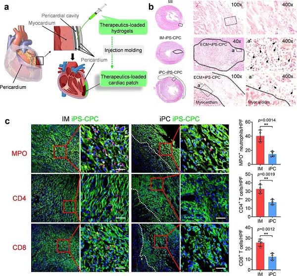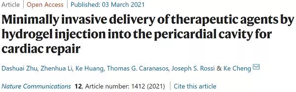 心臟貼片是一種向心臟遞送治療藥物的有效方法。然而,這種手術(shù)通常是侵入性且很難進(jìn)行的?;诖?,美國(guó)北卡羅萊納州立大學(xué)Ke Cheng(通訊作者)等人開發(fā)并測(cè)試一種方法,利用心包腔作為一個(gè)自然模型,在心包內(nèi)注射生物相容性水凝膠中的治療藥物后原位形成心臟貼片。在嚙齒類動(dòng)物心肌梗死模型中,作者證明了心包內(nèi)注射是一種有效且安全的方法來遞送含有誘導(dǎo)多能干細(xì)胞衍生的心臟前體細(xì)胞或間充質(zhì)干細(xì)胞來源的外泌體的水凝膠。在注射后,水凝膠在心包腔形成心臟貼片狀結(jié)構(gòu),減輕免疫反應(yīng),增加治療藥物的心臟滯留時(shí)間。通過強(qiáng)大的心血管修復(fù)和心外膜源性細(xì)胞的刺激,遞送的治療減輕心臟重構(gòu)和改善心肌梗死后心臟功能。此外,作者在臨床相關(guān)的豬模型上證明了微創(chuàng)心包內(nèi)注射的可行性。總之,該研究證實(shí)了心包內(nèi)注射是一種安全有效的方法,可以將治療性水凝膠遞送到心臟進(jìn)行心臟修復(fù)。