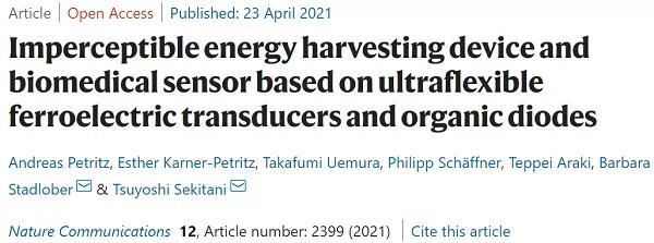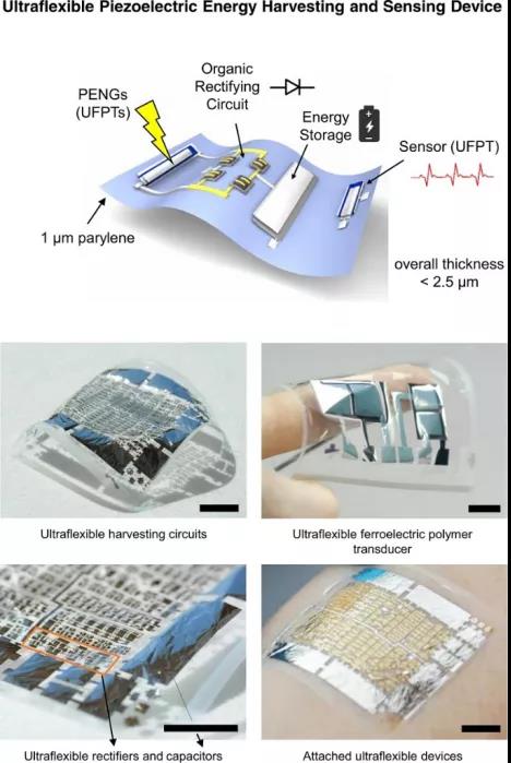 能源自主性和整合性是下一代可穿戴和柔性電子產(chǎn)品的基本要素,用于醫(yī)療保健、機(jī)器人和信息物理系統(tǒng)?;诖耍?/span>日本大阪大學(xué)Tsuyoshi Sekitani和奧地利Barbara Stadlober(共同通訊作者)等人首次報(bào)道了一種由壓電納米發(fā)電機(jī)、二極管整流器和儲(chǔ)能電容組成的綜合性超柔性能量收集器件(UEHD),所有組件的厚度均不超過2.5 μm,在僅1 μm的聚對(duì)二甲苯制成的薄基板上制成。當(dāng)附著在人體皮膚的表面上時(shí)難以察覺,作者展示了一種鐵電無線電子保健貼片,可以監(jiān)測(cè)脈搏率并測(cè)量血壓。納米發(fā)電機(jī)和傳感器都是基于P(VDF:TrFE)70:30的超柔性鐵電聚合物傳感器(UFPTs)。同時(shí),結(jié)合了由有機(jī)二極管制成的超柔性全波整流器電路,具有短OTFT幾何形狀和超柔性薄膜電容器使用納米氧化鋁薄層。作者采用DNTT(二萘并噻吩)作為有機(jī)半導(dǎo)體的二極管顯示出很高的整流比,超過107,并且由于它們的過電壓低于100 mV,因此內(nèi)置的電壓降可忽略不計(jì)。其中,UFPTs具有以下優(yōu)點(diǎn):(1)超柔韌性,使其能夠共形附著于各種材料和表面,并允許將多層UFPTs堆疊在3D形狀的載體上;(2)對(duì)平面外(橫向)應(yīng)力的高靈敏度,可通過多層堆疊提高,從而實(shí)現(xiàn)預(yù)彎曲橡膠載體上三層堆疊的峰值靈敏度在15 nC N-1范圍內(nèi);(3)極好的機(jī)械穩(wěn)定性,允許在40 μm彎曲半徑下穩(wěn)定運(yùn)行;(4)響應(yīng)時(shí)間非常短,遠(yuǎn)低于20 ms N-1。此外,UFPTs用作脈沖電源時(shí),峰值功率密度超過3 mW cm-3。
