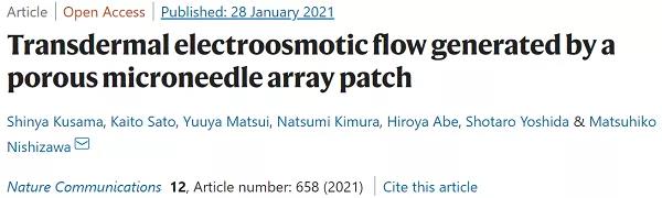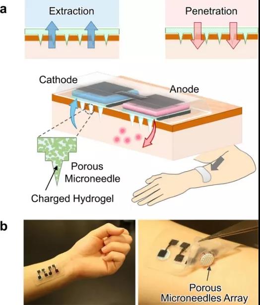 微針陣列是一種具有吸引力的選擇,通過微創(chuàng)手段來突破皮膚屏障進(jìn)行有效的透皮給藥?;诖?,日本東北大學(xué)Matsuhiko Nishizawa(通訊作者)等人報(bào)道了一種基于固體聚合物的離子導(dǎo)電多孔微針(PMN)貼片,其可應(yīng)用于改善離子透入方面,是一種通過皮膚的直流電增強(qiáng)透皮分子傳輸?shù)募夹g(shù)。利用帶電水凝膠修飾的PMN在離子電滲療法中有以下三個(gè)創(chuàng)新優(yōu)勢(shì):(1)通過低侵入性穿刺高阻力角質(zhì)層來降低透皮阻力;(2)通過相互連接的微孔輸送大分子;(3)產(chǎn)生電滲流(EOF)。特別是,PMN產(chǎn)生的EOF極大地提高了透皮分子的滲透或提取,類似于由外部壓力引起的流動(dòng)。作者利用豬皮樣品證明了EOF輔助遞送模型藥物(右旋糖酐)和葡萄糖提取的提高效率。此外,通過內(nèi)置的酶生物電池(果糖/O2電池)為基于PMN的透皮EOF系統(tǒng)供電也被證明是一種可能的全有機(jī)離子導(dǎo)入貼片。