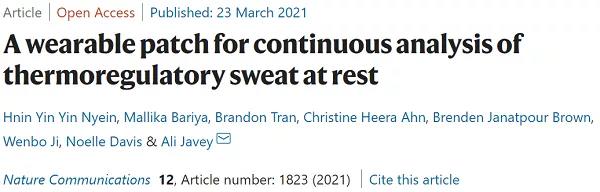 在久坐和日?;顒?dòng)中,人體自然持續(xù)地分泌汗液進(jìn)行體溫調(diào)節(jié),其速率可以反映潛在的健康狀況,包括神經(jīng)損傷、自主神經(jīng)和代謝紊亂以及慢性應(yīng)激。然而,低分泌率和蒸發(fā)對(duì)收集靜止的體溫調(diào)節(jié)汗液進(jìn)行無創(chuàng)的身體生理學(xué)分析提出了挑戰(zhàn)?;诖?,美國(guó)加州大學(xué)伯克利分校Ali Javey(通訊作者)等人報(bào)道了一種可穿戴式的貼片,將其用于在休息時(shí)連續(xù)監(jiān)測(cè)汗液,使用微流控技術(shù)來防止蒸發(fā),并且實(shí)現(xiàn)對(duì)分泌速率的選擇性監(jiān)測(cè)。作者將用于快速吸汗的親水性填充物集成到傳感通道中,減少了實(shí)時(shí)測(cè)量所需的汗液累積時(shí)間。此外,作者還集成了用于pH、Cl-和左旋多巴監(jiān)測(cè)的電化學(xué)傳感器。作者還展示了與日常活動(dòng)、應(yīng)激事件、低血糖引起的出汗和帕金森病相關(guān)的動(dòng)態(tài)出汗分析的貼片功能。通過支持與久坐、常規(guī)和日?;顒?dòng)兼容的汗液分析,這些貼片可以在休息時(shí)對(duì)身體生理進(jìn)行連續(xù)、自主的監(jiān)測(cè)。