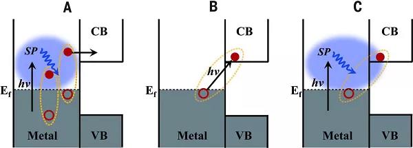 密歇根大學的Suljo Linic團隊[1]就在等離子激元介導的小分子活化體系中就證實了光熱催化的路徑之一是間接電子轉(zhuǎn)移(indirect electron transfer)。在這一路徑中,熱電子(hot electron)首先從經(jīng)過等離子激發(fā)的金屬納米顆粒中產(chǎn)生,隨后轉(zhuǎn)移到被吸附在金屬表面的化合物的最低未占分子軌道(LUMO)上進行反應。由于在這一路徑中電子轉(zhuǎn)移發(fā)生在熱電子產(chǎn)生之后,其容易受到因電子-電子散射引起的能量損失的制約。這一間接電子轉(zhuǎn)移的效率與入射光子能量展現(xiàn)出正相關(guān)關(guān)系,即更高的能量能夠產(chǎn)生更多的電子以注入被吸附物的LUMO中。