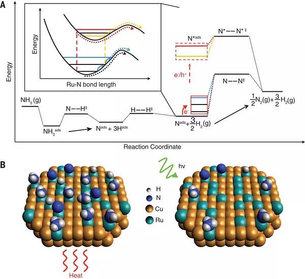 在以等離子體金屬納米顆粒為代表的催化劑發(fā)揮光熱催化效果時,產(chǎn)生熱電荷載流子可活化反應物、并降低反應的總能壘。然而,在這過程中的熱和電子激發(fā)的關(guān)系尚不清楚。針對這一問題,萊斯大學的Peter Nordlander和Naomi J. Halas[3]等人通過研究氨氣分解來分析光和熱激發(fā)的作用。在銅合金納米構(gòu)造中,通過吸收光產(chǎn)生電子可活化在釕表面原子上的氮原子。通過測量不同波長、光強和催化劑表面溫度下的反應速率,可以定量表觀活化能壘,厘清熱載流子的作用,并為設計高效光催化劑奠定了基礎(chǔ)。