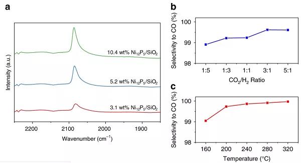近期,中山大學匡代彬教授和多倫多大學Geoffrey A. Ozin教授(共同通訊作者)首次報道了金屬磷化物可作為一種高活性、選擇性、穩(wěn)定性的光催化二氧化碳加氫催化劑。研究以磷化鎳(Ni12P5)為原型,這一磷化物的結(jié)構(gòu)建立在將高分散鎳納米簇集成到磷晶格中的基礎(chǔ)上,可以在整個太陽光光譜范圍高度富集光能。由于該化合物具有獨特的線性鍵合的鎳-羰基占主導的反應路徑,磷化鎳被發(fā)現(xiàn)是一種光熱催化劑,可實現(xiàn)逆水煤氣變換反應,一氧化碳的生產(chǎn)速率為960?±?12?mmol?gcat?1?h?1,選擇性近乎100%,同時還具有長期穩(wěn)定性。不僅如此,磷化鈷也被發(fā)現(xiàn)具有相似的特性,這說明金屬磷化物可作為具有高速率和選擇性的光熱二氧化碳催化劑。