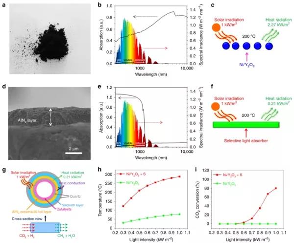 河北大學的李亞光、王淑芳和浙江師范大學的胡勇、日本國立物質(zhì)材料研究所葉金花(共同通訊作者)得益于添加可以同時吸收太陽光全譜和產(chǎn)生熱輻射的選擇性光吸收劑,制造了新型光熱轉(zhuǎn)換器件,可以吸收95%的太陽光,熱輻射僅為報道吸光材料的1/10,能夠在標準太陽光輻照下產(chǎn)生288 °C的高溫,是傳統(tǒng)吸光材料的三倍以上,可實現(xiàn)標準太陽光驅(qū)動下的二氧化碳甲烷化光熱化。不僅如此,他們還制備了負載單原子鎳的非晶Y2O3二維納米片,作為高效甲烷化催化劑。在選擇性吸光劑光熱器件和負載型非晶Y2O3二維納米片的協(xié)同作用下,實現(xiàn)了室外太陽光(0.52到0.7個標準太陽光強度)輻照的高效二氧化碳甲烷化,其轉(zhuǎn)化效率和甲烷產(chǎn)率可分別達到80%和7.5 l m?2 h?1。