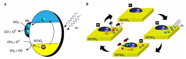 近期,日本高知工科大學的Takeshi Fujita、國立材料科學研究所的Hideki Abe和東京工業(yè)大學的Masahiro Miyauchi(共同通訊作者)等人報告了一種SrTiO3支撐的銠(Rh/STO)催化劑,可在無熱源低溫條件下、通過紫外光輻照有效提升甲烷重整,從而實現(xiàn)典型熱催化無法實現(xiàn)的功能。研究顯示,光激發(fā)空穴和電子可分別用于STO上的甲烷氧化和銠上的二氧化碳還原。同位素分析則清楚地表明晶格氧(O2?)扮演著傳遞者的角色,可進一步驅(qū)動甲烷干重整反應。研究認為,這一材料設計可以進行進一步擴展,從而利用光子能量來從不同碳源中獲得有價值的產(chǎn)品。
