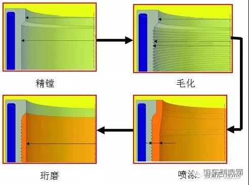 通過與國外噴涂廠家的交流,我們試制了噴涂缸體,掌握了等離子噴涂的工藝流程:缸孔精鏜—缸孔毛化—清洗—缸孔噴涂—過噴涂處理—最終珩磨。在此,對噴涂工藝的關(guān)鍵工序(見圖2)展開分析。