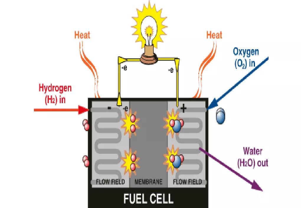 所謂氫燃料電池就是氫氣與氧氣通過電化學(xué)反應(yīng)產(chǎn)生電能的能量轉(zhuǎn)化裝置。其放電的機(jī)理是氫氣從陽極進(jìn)入,在催化劑的作用下釋放電子形成帶正電荷的氫離子,接著氫離子從陽極穿過電解質(zhì)膜跑到負(fù)極與氧氣結(jié)合生產(chǎn)水,而電子則源源不斷的流入電路形成電流。