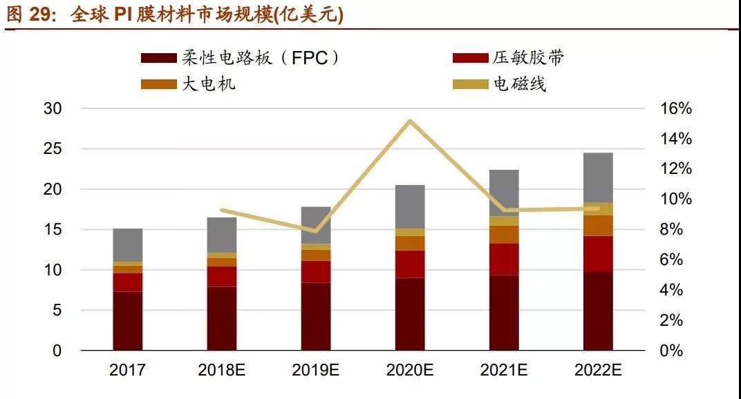 PI 薄膜是市場規(guī)模最大的聚酰亞胺細分領域。2010 年以來,智能手機、電子顯示、柔 性電路板等領域快速發(fā)展,驅動 PI 薄膜產業(yè)快速發(fā)展。在 5G 與消費電子創(chuàng)新周期的 驅動下,天線材料、電子元器件、柔性顯示等領域有望維持強勁的發(fā)展勢頭。另外,主 要國家在航空航天領域加大投入,將會拉動高性能特種 PI 膜的需求。