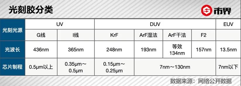 一定程度上來說,光刻出的電路圖案越精密,就代表著芯片性能越好。采用不同的光刻光線,對應(yīng)地需要搭配不同的光刻膠。目前,根據(jù)不同的光波長,光刻膠大致可以分為G線、I線、KrF、ArF、EUV這幾類。