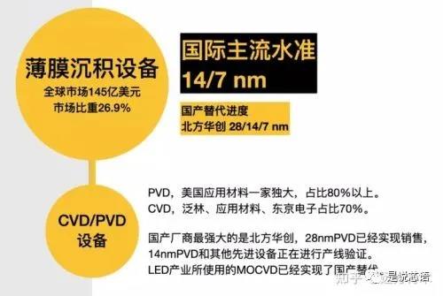 薄膜沉積設備領域最強的是美國和日本,都可以搞定5nm技術,兩國合計占據70~80%左右的市場份額。目前,中國國內的存量薄膜沉積設備98%來自于進口,國產化率僅為2%,因為中國以前造不出來。但最近幾年,中國取得了技術突破,最先進廠商為北方華創(chuàng)。目前,中國28nm級別的設備已經成功實現(xiàn)銷售,14nm設備正在生產線進行磨合驗證。