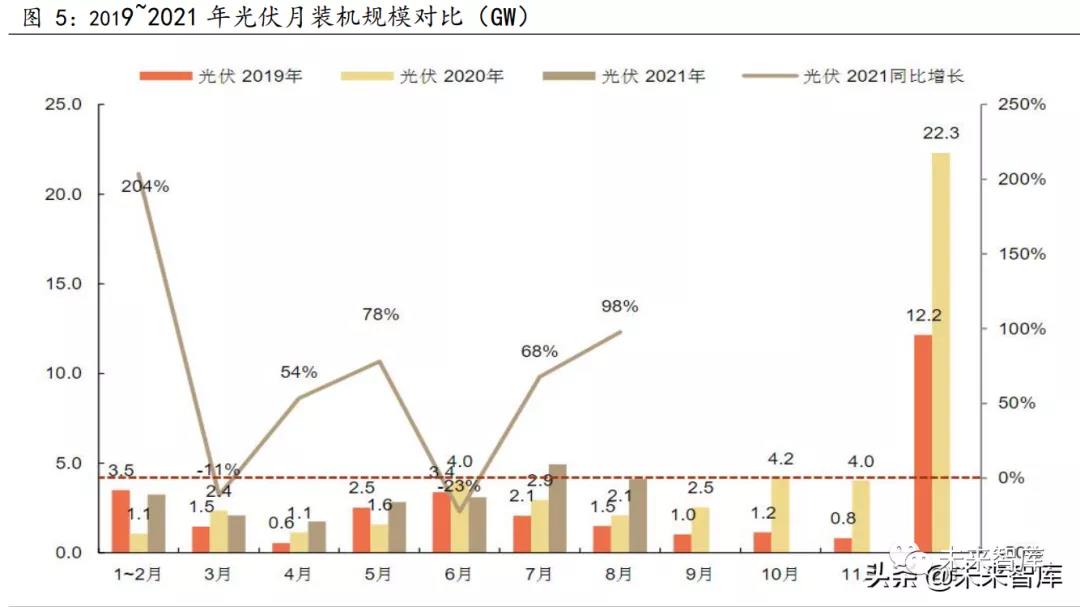 2021 年 1—8月份,全國發(fā)電裝機容量228254 萬千瓦,同比增長 9.5%, 發(fā)電 53894 億千瓦時,同比增長 11.3%。其中,太陽能發(fā)電裝機 27513 萬 千瓦,同比增長 24.6%,太陽能發(fā)電增長 8.5%。在 2021 年保障性并網(wǎng)規(guī) 模不低于 90GW 的政策指引下,四季度需求將得到顯著提振。