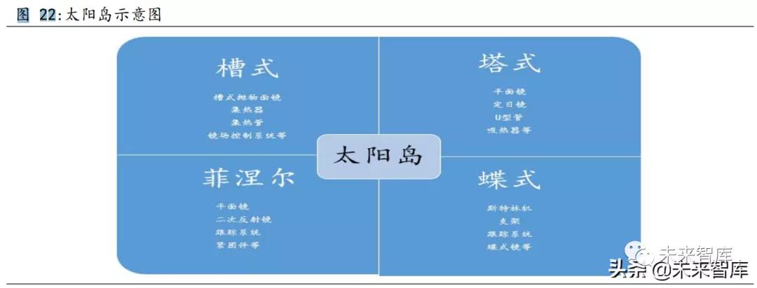 光熱發(fā)電產(chǎn)業(yè)從電站的結(jié)構(gòu)來說,其產(chǎn)業(yè)涉及到太陽島、傳儲熱島、 常規(guī)島、工程咨詢服務(wù)以及原材料與配件供應(yīng)等鏈條。