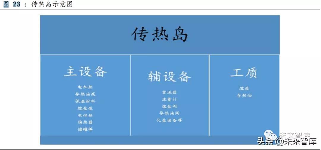 傳儲熱島則分為主設(shè)備、輔設(shè)備和工質(zhì)三部分,主要涉及換熱器、熔 鹽泵、熔鹽閥、流量計、電加熱及電伴熱等裝備以及熔鹽、導熱油等傳儲 熱工質(zhì)。