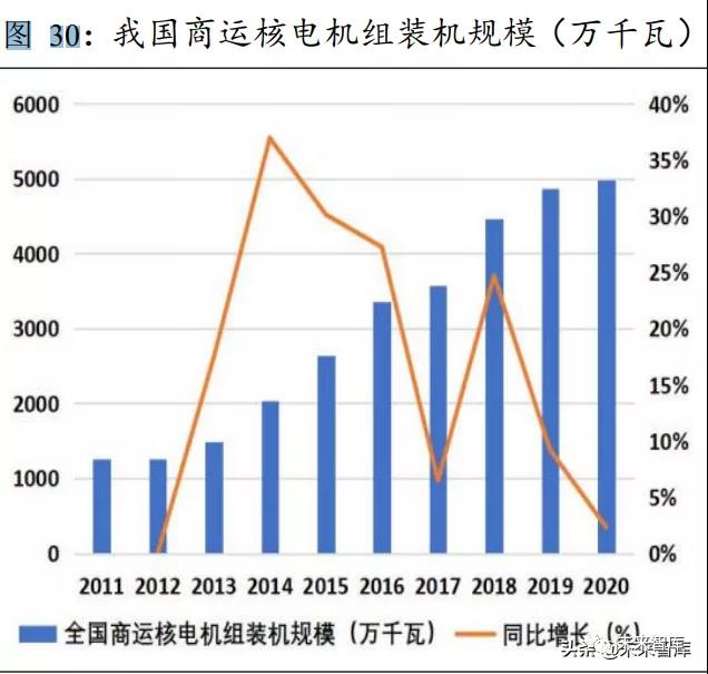 根據(jù)核電專業(yè)媒體《核電觀察》在 1 月發(fā)表的年度展望中曾測算,要 實現(xiàn) 2030 年非化石能源占一次能源消費比重 25%以上,綜合考慮風電、 太陽能、水電的發(fā)展空間以及核電的建設(shè)周期,需要十四五期間至少新開 工 3500 萬千瓦核電機組,即 30-35 臺百萬千瓦核電機組,年均新開工 6-8 臺機組,屆時至 2030 年核電裝機容量可達到 1 億至 1.1 億千瓦。