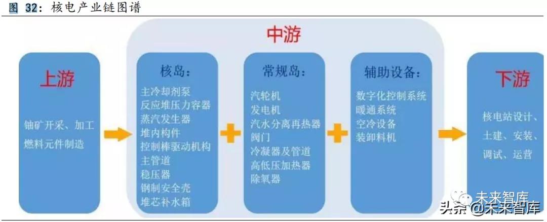 核電產(chǎn)業(yè)鏈的上游為鈾礦開采加工精煉、鈾轉(zhuǎn)化濃縮和核燃料組件制 造;中游為核電設(shè)備制造環(huán)節(jié),主要包括核島設(shè)備、常規(guī)島設(shè)備和輔助設(shè) 備;下游是核電站建設(shè)運營及乏燃料處理等。核電具有建設(shè)周期長、投資 規(guī)模大的特點,核電建設(shè)既可以發(fā)揮穩(wěn)定投資的作用又有推動未來能源結(jié) 構(gòu)優(yōu)化具有重要作用。在新一輪政策的引導下,核電整個產(chǎn)業(yè)鏈發(fā)展空間 有望獲得提升。