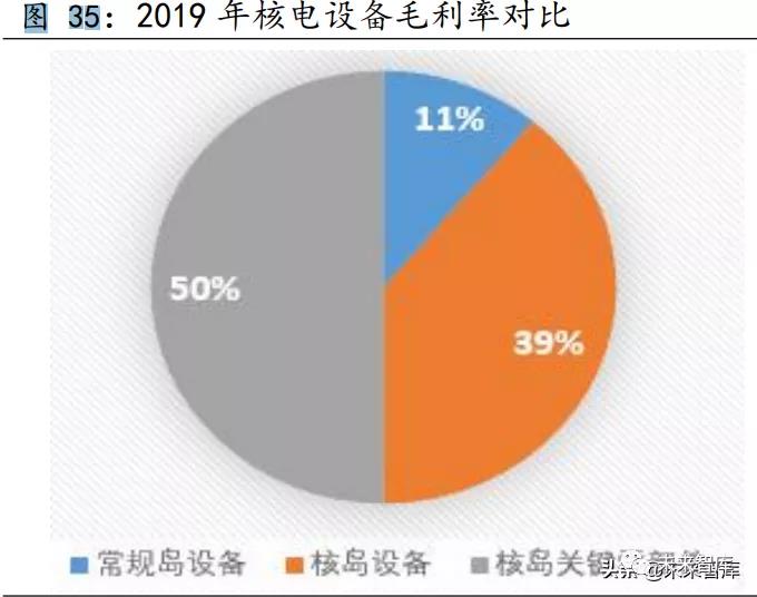 核島設(shè)備制造是核電國產(chǎn)化的核心,壟斷程度高,技術(shù)壁壘高,毛利率接近 40%。核電站建設(shè)成本占比最高,達到 64.3%,其中,核電設(shè)備 在核電站建設(shè)中所占成本最高,其比例高達 50%,而核電設(shè)備中核島成本 占比最高,達到 58%,因為核島工藝復(fù)雜,且安全性要求極高,核島中的 關(guān)鍵部件由于制造工藝要求高,制造所需資產(chǎn)均由國企壟斷。常規(guī)島與輔 助系統(tǒng)由于技術(shù)壁壘低,價格明顯下降,成本占比也相應(yīng)下降,毛利率水 平僅為 10%左右。