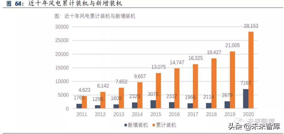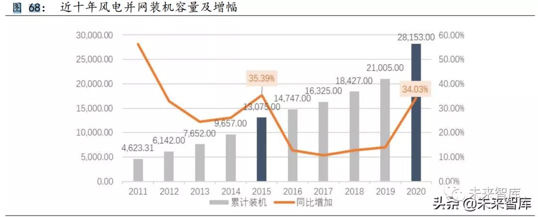 受搶裝潮影響,2020 年以及 2021 年風電發(fā)電機組裝機容量大幅攀升。截止 2020 年,新增并網(wǎng)裝機 7167 萬千瓦,累計裝機 28153 萬千瓦。同比 增幅超過 30%。2021 年上半年,風電累計裝機 2.92 億千瓦,同比增長 34.7%, 占并網(wǎng)發(fā)電裝機容量的 12.9%。