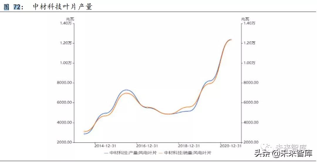 根據(jù)中材科技歷史財務(wù)數(shù)據(jù)測算,21 年中材科技葉片收入占比將有 所下滑,從 40%左右下滑至 30%左右。根據(jù)公司歷史財務(wù)數(shù)據(jù)顯示,中報 營業(yè)收入占全年營業(yè)收入的 40%左右,保守估計公司 21 年葉片收入在 70 億左右,貢獻毛利大概在 14.7 億左右。