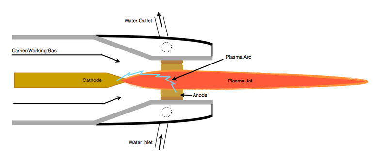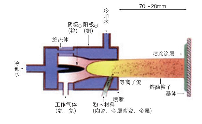 大氣等離子噴涂(APS)是應(yīng)用最早、最廣的一種熱噴涂技術(shù),整個(gè)噴涂過(guò)程在大氣環(huán)境下進(jìn)行。APS通常利用Ar、N2和He作為工作介質(zhì),其核心部件是等離子噴槍?zhuān)ぷ髟硎窃陉?yáng)極和陰極之間通入上述工作氣體作為介質(zhì),使其電離并產(chǎn)生等離子弧,通過(guò)等離子弧的作用進(jìn)一步將噴涂材料加熱至熔融或半熔融狀態(tài)后進(jìn)行噴涂。