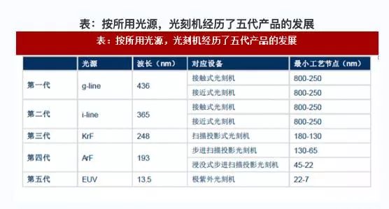 根據(jù)所使用的光源的改進(jìn)以及雙工作臺(tái)、沉浸式光刻等新型光刻技術(shù)的創(chuàng)新與發(fā)展,光刻機(jī)經(jīng)歷了 5 代產(chǎn)品的發(fā)展,每次光源的改進(jìn)都顯著提升了升光刻機(jī)的工藝制程水平,以及生產(chǎn)的效率和良率。