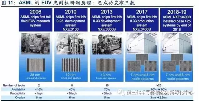 光刻機(jī)龍頭企業(yè) ASML 從 1999 年開始 EUV 光刻機(jī)的研發(fā)工作,原計(jì)劃在 2004 年推出產(chǎn)品。但直到 2010 年 ASML 才研發(fā)出第一臺(tái) EUV 原型機(jī), 2016 年才實(shí)現(xiàn)下游客戶的供貨,比預(yù)計(jì)時(shí)間晚了十幾年。直到2019年,第一款7nm EUV 工藝的芯片 Exynos 9825 才正式商用。