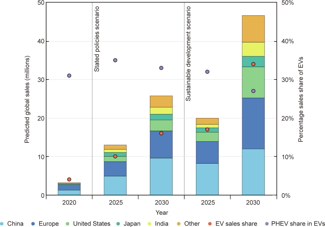 圖1 基于當(dāng)前(2020年)公布的國家政策(中間和左側(cè)欄)和可持續(xù)發(fā)展形勢(右側(cè)欄),預(yù)計(jì)電動(dòng)汽車國際銷量如圖所示。橙色圓圈代表電動(dòng)汽車銷量占汽車總銷量的比例,紫色圓圈代表插電式混合動(dòng)力電動(dòng)汽車(PHEV)銷量在所有電動(dòng)汽車銷量中所占的比例。來源:International Energy Agency,經(jīng)許可。