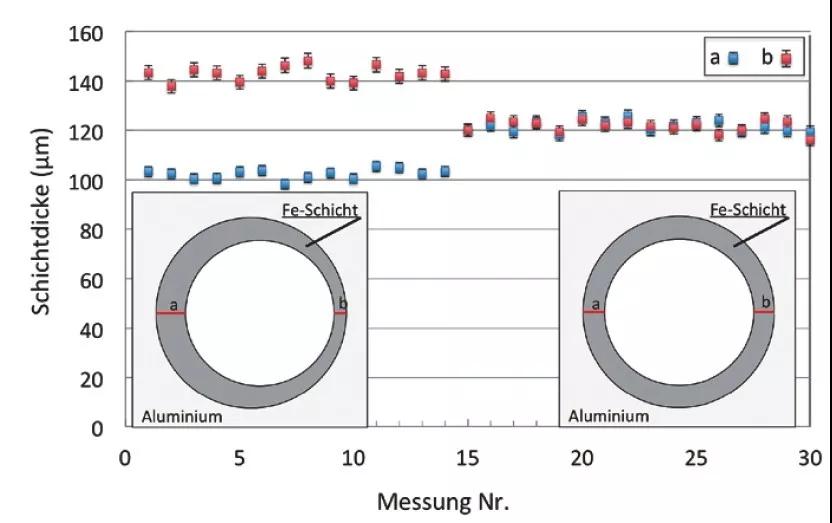 在工藝早期測(cè)量涂層厚度,可以省去增值鏈中的任何后續(xù)處理步驟,例如涂層厚度過低。對(duì)于粗糙的噴涂表面,傳統(tǒng)涂層厚度測(cè)量?jī)x器具有低重復(fù)精度,因此不適合質(zhì)量保證。通過顯微照片進(jìn)行隨機(jī)檢查是非常耗時(shí)的,并且不允許對(duì)涂層工藝進(jìn)行無縫且無損的檢查。相反,Winterthur公司的設(shè)備CoatMaster可測(cè)量表面1-3毫米的直徑的區(qū)域得出涂層厚度。結(jié)果顯示,即使在高粗糙度下,也實(shí)現(xiàn)了1至2%的高重復(fù)精度,測(cè)量時(shí)間少于一秒。因此,在批量生產(chǎn)中也可以測(cè)試每個(gè)孔的多個(gè)測(cè)量點(diǎn)。