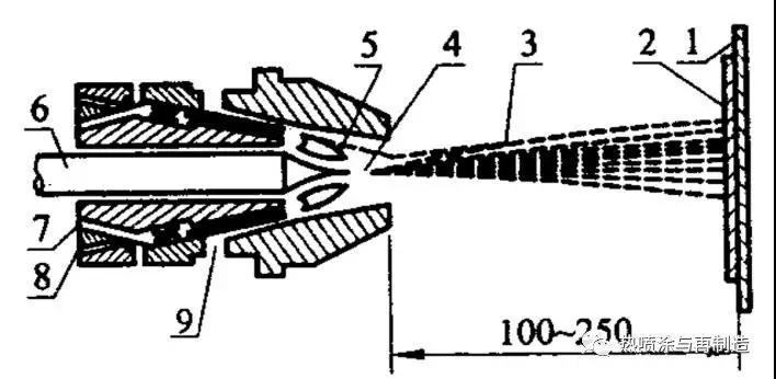 1-基材;2-涂層;3-噴涂束流;4-熔融材料;5-火焰;6-線材或棒材;
