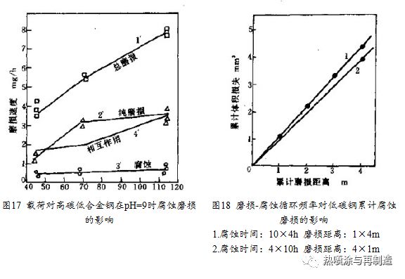 在單純的腐蝕作用中,失重與腐蝕時間的關(guān)系通常是凹曲線,而一般的干磨損(在空氣中磨損)材料流失量與載荷(速度)大多呈線性關(guān)系。腐蝕磨損則不符合這兩種規(guī)律,它們間的交互作用通常都表現(xiàn)為加速, 用下式表示: