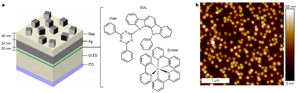 使用量子點對精確的顏色信息進行可視化已經(jīng)探索了數(shù)十年,并且采用環(huán)保材料的商業(yè)產(chǎn)品目前可以用作背光源。然而,基于量子點的下一代電致發(fā)光顯示器需要開發(fā)有效且穩(wěn)定的無鎘的藍光發(fā)射裝置,由于藍光發(fā)射材料的光物理性能較差,這仍然是一個挑戰(zhàn)。三星先進技術(shù)研究院介紹了ZnSe基藍色發(fā)光量子點的合成。作者發(fā)現(xiàn)氫氟酸和氯化鋅添加劑可通過消除ZnSe晶體結(jié)構(gòu)中的堆垛層錯而有效提高發(fā)光效率。另外,通過液體或固體配體交換的氯化物鈍化導(dǎo)致緩慢的輻射復(fù)合,高的熱穩(wěn)定性和有效的電荷傳輸性質(zhì)。文章在發(fā)光二極管中構(gòu)造了具有梯度氯化物含量的雙量子點發(fā)射層,以促進空穴傳輸,并且所得器件在理論極限下顯示出效率,高亮度和長使用壽命。作者認為高效、穩(wěn)定的藍色量子點發(fā)光器件可以促進使用量子點的電致發(fā)光全色顯示器的開發(fā)。Efficient and stable blue quantum dot light-emitting diode.(Nature, 2020, DOI:10.1038/s41586-020-2791-x)3.UDC Nature:等離子增強有機發(fā)光器件的穩(wěn)定性和亮度