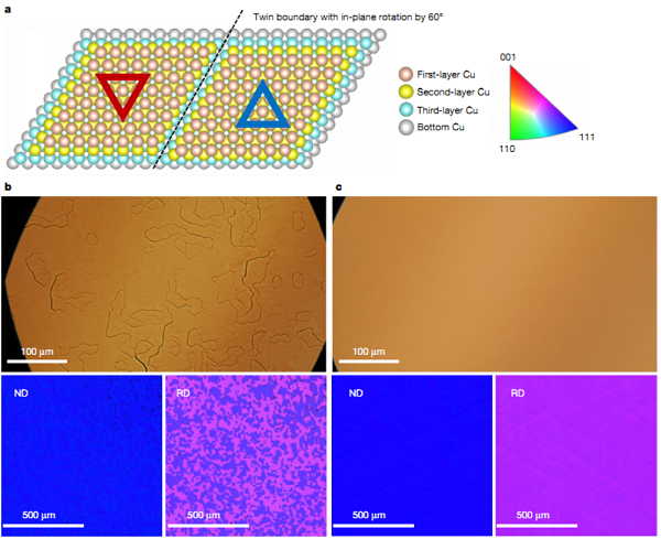 研究固體材料中電磁波和自由電子的共振相互作用的等離激元理論領(lǐng)域,由于等離激元材料中通常會發(fā)生大量損耗,因此尚未投入大規(guī)模商業(yè)應(yīng)用。由于其良好的色彩飽和度,通用的形狀因數(shù)和低功耗,有機發(fā)光器件(OLED)已被并入數(shù)十億個商業(yè)產(chǎn)品中,但在效率和穩(wěn)定性方面仍可以得到改善。盡管結(jié)合了有機熒光粉的OLED實現(xiàn)了內(nèi)部的電荷到光的統(tǒng)一轉(zhuǎn)換,但它們的折射率對比卻將設(shè)備外光子的可觀察部分降低了約25%。此外,在OLED操作期間,緩慢衰減的三重態(tài)激子和電荷的局部累積會在稱為老化的過程中逐漸降低設(shè)備的亮度,這可能會導(dǎo)致顯示屏出現(xiàn)“烙印”現(xiàn)象。同時提高設(shè)備效率和穩(wěn)定性對于OLED技術(shù)至關(guān)重要。美國UDC(Universal Display Corporation)演示了一種OLED,它利用等離子體系統(tǒng)的衰減率提高來提高設(shè)備穩(wěn)定性,同時通過結(jié)合基于納米粒子的外耦合方案從等離子體激元模式中提取能量來保持效率。使用原型磷光發(fā)射器,可以在與參考常規(guī)設(shè)備相同的亮度下將操作穩(wěn)定性提高兩倍,同時還可以從等離激元模式中提取16%的能量作為光。這個工作提高OLED穩(wěn)定性的方法避免了特定于材料的設(shè)計,并且適用于當前用于照明面板,電視和移動顯示器的所有商用OLED。Plasmonic enhancement of stability and brightness in organic light-emitting devices.(Nature, 2020, DOI:10.1038/s41586-020-2684-z)4.臺積電&臺灣陽明交通大學(xué)&萊斯大學(xué)Nature:Cu(111)上的晶圓級單晶六方氮化硼六方氮化硼單層