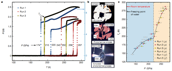 超薄二維(2D)半導(dǎo)體層狀材料為擴展摩爾定律在集成電路中的晶體管數(shù)量提供了巨大的潛力。2D半導(dǎo)體的一個主要挑戰(zhàn)是避免從相鄰的電介質(zhì)形成電荷散射和捕獲位點。六方氮化硼(hBN)的絕緣范德華層提供了出色的界面電介質(zhì),有效地減少了電荷散射。最近的研究表明,在熔融金表面或塊狀銅箔上單晶hBN薄膜的生長。然而,由于熔融金的高成本,交叉污染以及過程控制和可擴展性的潛在問題,因此不被工業(yè)所青睞。銅箔可能適用于卷對卷工藝,但不太可能與晶圓上的先進微電子制造兼容。因此,可靠的直接在晶圓上生長單晶hBN薄膜的方法將有助于在工業(yè)中廣泛采用2D層狀材料。先前在Cu(111)金屬上生長hBN單層的嘗試未能實現(xiàn)單取向,當這些層合并成flms時會導(dǎo)致有害的晶界。人們甚至認為從理論上講,在諸如Cu(111)這樣的高對稱性表面上生長單晶hBN是不可能的。臺積電&臺灣陽明交通大學(xué)&萊斯大學(xué)報道了在兩英寸c面藍寶石晶片上的Cu(111)薄膜上成功完成了單晶hBN單層的外延生長。第一性原理計算結(jié)果證實了這一令人驚訝的結(jié)果,這表明通過hBN橫向?qū)又罜u(111)步驟可增強外延生長,從而確保hBN單層的單向性。所獲得的單晶hBN在底柵結(jié)構(gòu)中作為二硫化鉬和二氧化鉿之間的界面層并入,提高了晶體管的電性能。這種生產(chǎn)晶圓級單晶hBN的可靠方法為將來的2D電子學(xué)鋪平了道路。Wafer-scale single-crystal hexagonal boron nitride monolayers on Cu (111).(Nature, 2020, DOI:10.1038/s41586-020-2009-2)5.羅徹斯特大學(xué)&英特爾:氫化碳硫中的室溫超導(dǎo)