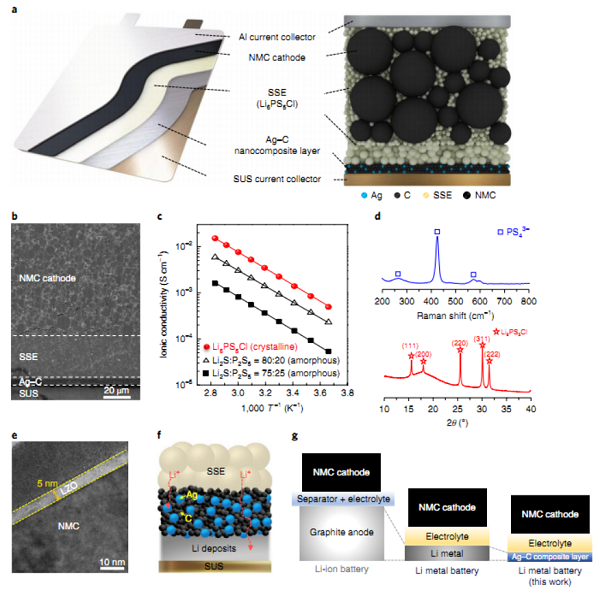 具有鋰金屬陽極的全固態(tài)電池是超越常規(guī)鋰離子電池性能的強大選擇。然而,不希望的鋰枝晶生長和低庫侖效率阻礙了它們的實際應(yīng)用。三星先進研究院發(fā)現(xiàn),具有硫化物電解質(zhì)的高性能全固態(tài)鋰金屬電池是由不含過量鋰的Ag-C復(fù)合陽極實現(xiàn)的。薄的Ag-C層可以有效地調(diào)節(jié)Li的沉積,從而導(dǎo)致真正的長電化學(xué)循環(huán)性。在全電池演示中,作者使用了具有高比容量(> 210 mAh/g)和高面容量(> 6.8 mAh/cm2)的高Ni層狀氧化物陰極,以及一種銀輝石型硫化物電解質(zhì)。還引入了熱等靜壓技術(shù)以改善電極與電解質(zhì)之間的接觸。由此制備的原型袋式電池(0.6 Ah)表現(xiàn)出高能量密度(> 900 Wh/l),超過99.8%的穩(wěn)定庫侖效率和長循環(huán)壽命(1000次)。High-energy long-cycling all-solid-state lithium metal batteries enabled by silver-carbon composite anodes.