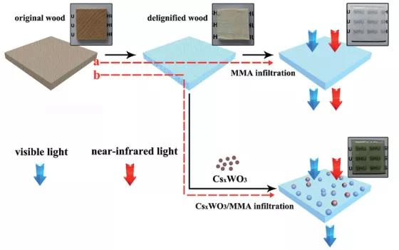 圖5 CsxWO3/透明木材的合成路線和樣品圖像。