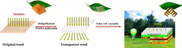 圖6 透明木材制備過(guò)程和在透明木材基底上組裝太陽(yáng)能電池的示意圖。