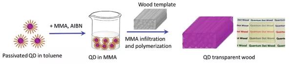https://www.sciencedirect.com/science/article/pii/S22112855163014101. Adv. Mater.: 發(fā)光透明木材包含活性熒光材料的功能光轉(zhuǎn)換層是許多器件中的必要組件。瑞典皇家理工學(xué)院Ilya Sychugov團(tuán)隊(duì)通過(guò)用富含量子點(diǎn)的甲基丙烯酸甲酯滲透木材模板,成功制造了結(jié)合光學(xué)和承載功能的發(fā)光透明木材。在這一轉(zhuǎn)變過(guò)程中,沒(méi)有檢測(cè)到光學(xué)退化的跡象,表明量子點(diǎn)與封裝用透明木材基質(zhì)間良好的相容性。木質(zhì)結(jié)構(gòu)引入了強(qiáng)散射,導(dǎo)致嵌入量子點(diǎn)的漫射發(fā)光,這對(duì)于平面光源和發(fā)光建筑構(gòu)件或家具是有利的。木材細(xì)胞壁的表面改性將有助于調(diào)節(jié)這種新材料的光散射特性,使其具有更廣泛的應(yīng)用前景。